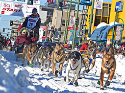 Das legendäre Iditarod-Rennen beginnt um 10 Uhr auf der 4th. Avenue in Anchorage. Beobachten Sie die Startvorbereitungen und genießen die geschäftige Rennatmosphäre, bevor die Teams von der Startlinie zum "1050-Meilen-Rennen nach Nome" aufbrechen. Die Parks von Anchorage bieten auch eine gute Alternative, um das Renngeschehen zu beobachten. Die Balto-Statue markiert den feierlichen Startpunkt des Iditarod. Balto war der letzte Schlittenhund in einer Hundeschlittenstaffel, die Impfstoff von Anchorage nach Nome brachte, gerade rechtzeitig, um eine Diphtherie-Epidemie im Jahr 1925 zu stoppen. Die Geschichte der Schlittenhundestaffel ist eine klassische Geschichte von Abenteuer und Aufopferung, denn die Musher riskierten unter brutalen Bedingungen ihr Leben, um ihre Mitbürger zu retten.