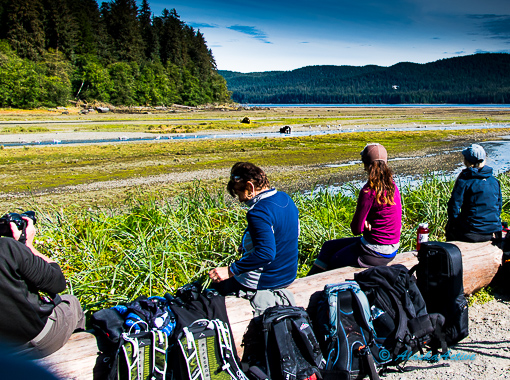Wir gehen einige hundert Meter am Ufer entlang zu den besten Aussichtspunkten, um Bären bei der Futtersuche oder bei der Lachsjagd zu beobachten. Die Bären, die wir sehen, sind Küstenbraunbären (Ursus arctos). Es handelt sich dabei um dieselbe Art wie der Grizzlybär, obwohl diese Bären in den Küstenregionen aufgrund des Überflusses an Wildlachs und anderer Nahrung viel größer werden.
